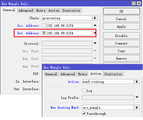 如上图,我们在dst-address设置了到目标192.168.99.0/24,并在前方勾选 ”!“(代表非),排除192.168.99.0/24,通过mangle参数就可排除策略路由导致访问内网失效的问题。